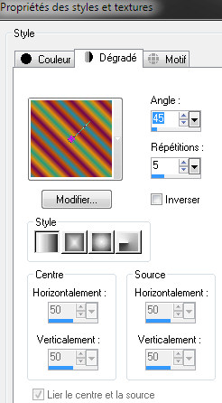 Paramétrez un dégradé linéaire angle 45°, 5 répétitions :