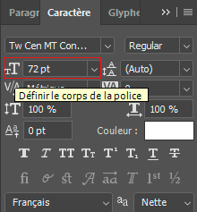 Dans la Palette caractères l'icône Définir le corps de la police va vous permettre d'intervenir sur la taille de la police.