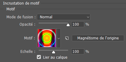 Incrustation de motif, choisissez le motif enregistré, cliquez sur Magnétisme de l'origine :