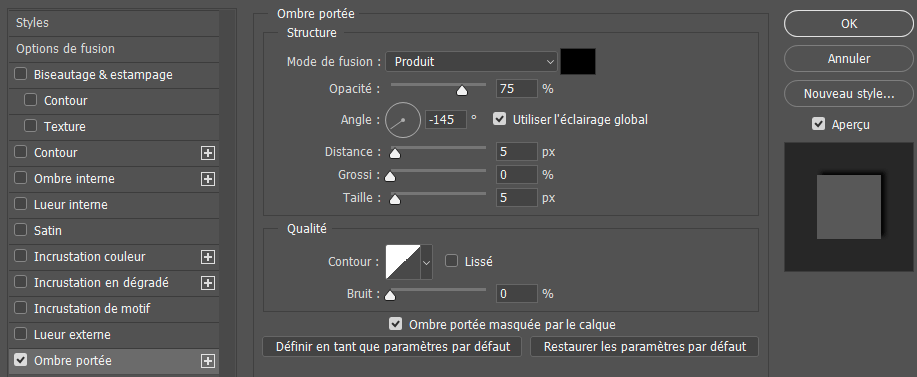 Au bas de la Palette Calques, cliquez sur Ajouter un style de calque, puis Ombre portée :