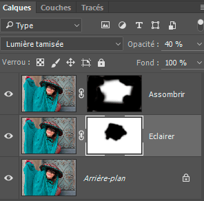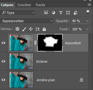 4 - Le calque Assombrir étant actif, choisissez le mode de fusion Superposition et réduisez l'opacité de ce calque à 40%.