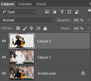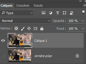Dans la Palette calques, masquez le calque arrière-plan en déactivant l'icône de l’œil et sélectionnez le Calque 1 :