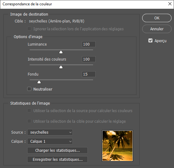 Luminance 100 - Intensité des couleurs 100 - Fondu, ajustez.