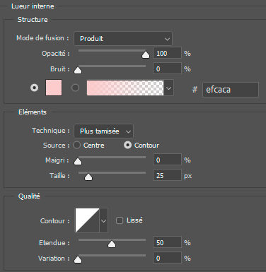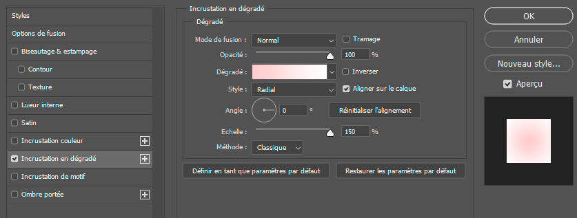 Ajoutez un style de calque Incrustation en dégradé avec le rose #efcaca comme couleur de premier plan et le blanc comme couleur d'arrière-plan :