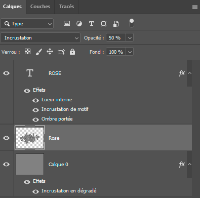 Choisissez le mode de fusion Incrustation et une opacité de 50% (à tester selon l'image choisie) :