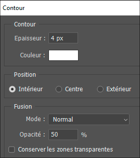 Édition, Contour : 4 pixels, en blanc, Opacité 50% :