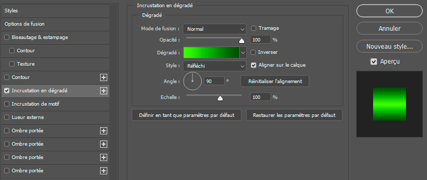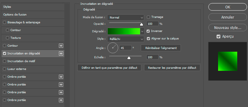 Dans l’incrustation en dégradé, cochez Inverser et modifiez l'angle du dégradé à 45 :