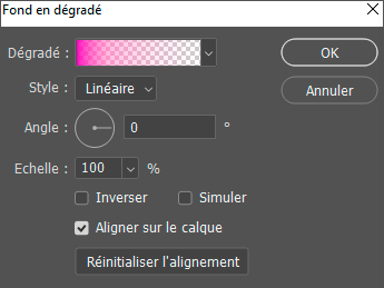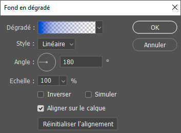Par défaut vous obtenez un dégradé couleur de premier plan vers transparent, Linéaire, définissez l'angle à 0°