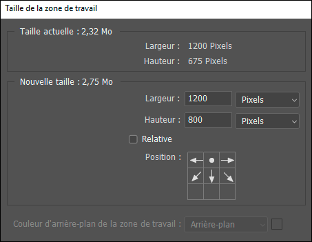 Décochez Relative, 1200 x 800 pixels, Position, Centre haut :