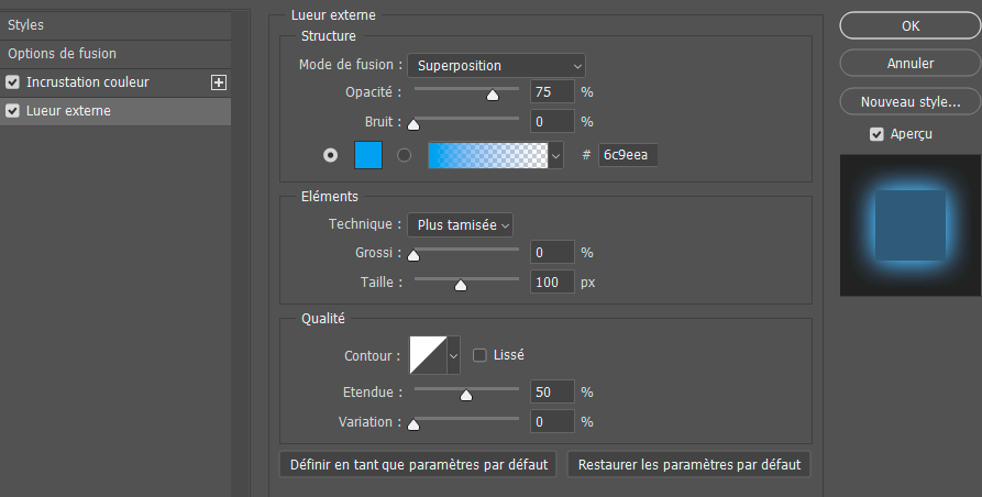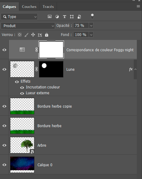 Dans la fenêtre Propriétés, choisissez FoggyNight.3DL, mode de fusion Produit, Opacité 75% :