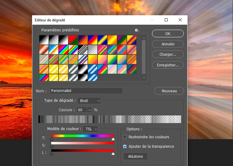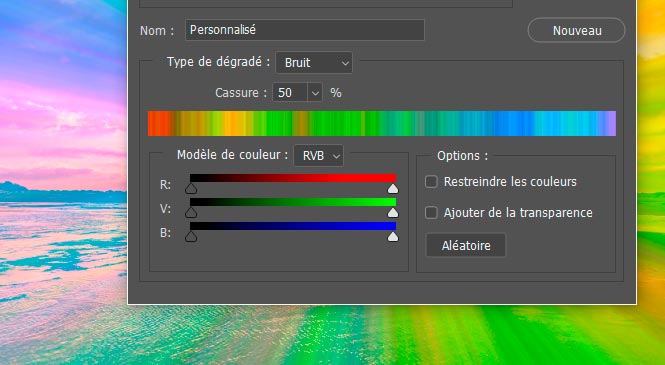 5 - Modifiez le dégradé Uniforme par Bruit. Vous obtenez un dégradé composé de diverses couleurs :