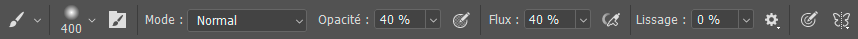 Dans la Barre d'options, définissez une Opacité de 40%, et un Flux de 40% :