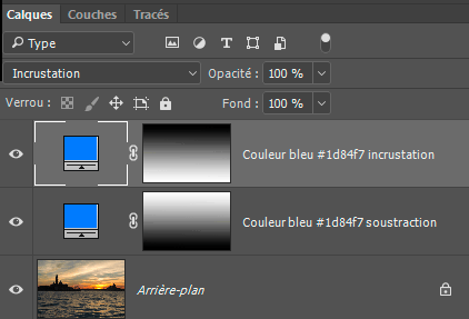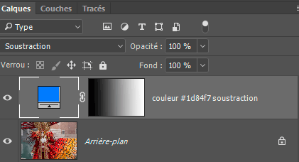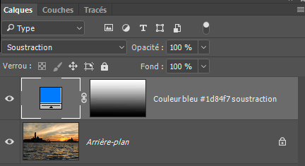 Couleur unie. Choisissez la couleur #1d84f7 et choisissez le mode de fusion Soustraction