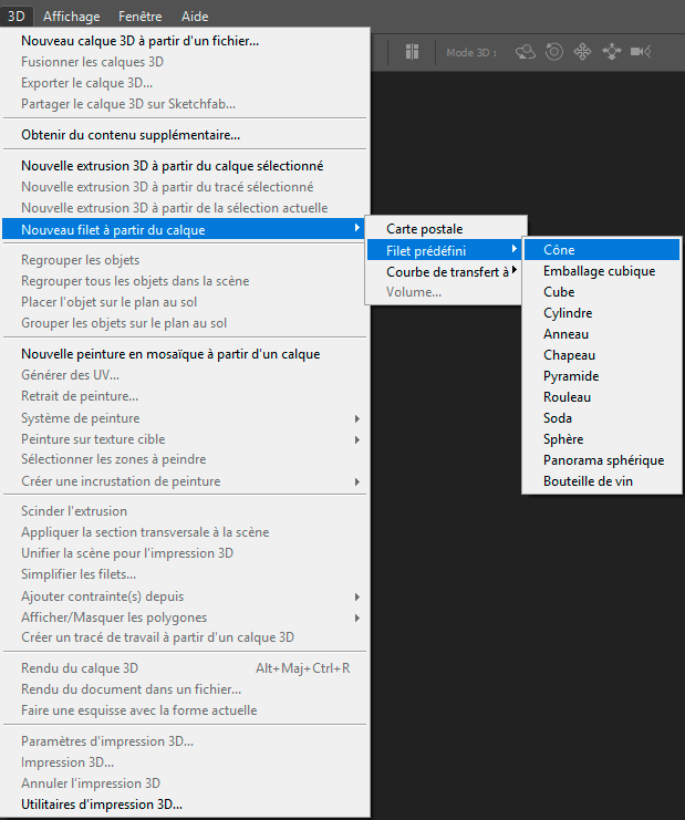 3 - 3D, Nouveau filet à partir d'un calque, Filet prédéfini, Cône :