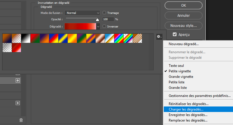 Cliquez sur le petit triangle à droite du dégradé puis, Charger les dégradés :