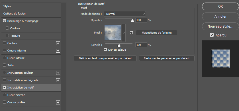 Ne fermez pas la boîte de dialogue, cliquez sur Incrustation de motif et choisissez le motif enregistré :