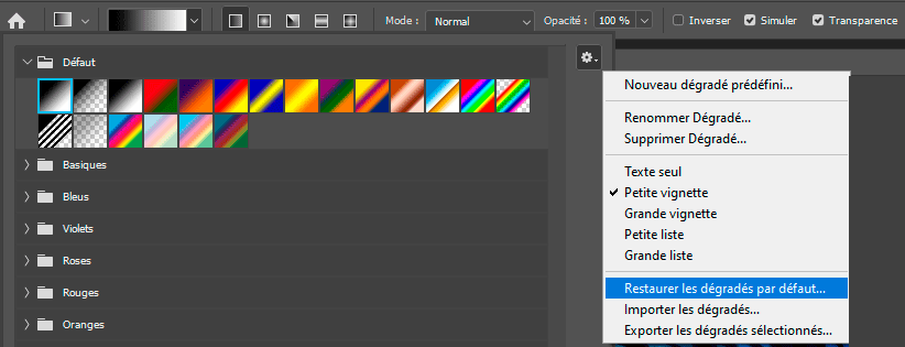 Si celui-ci n'apparaît pas, cliquez sur Restaurer els dégradés par défaut :