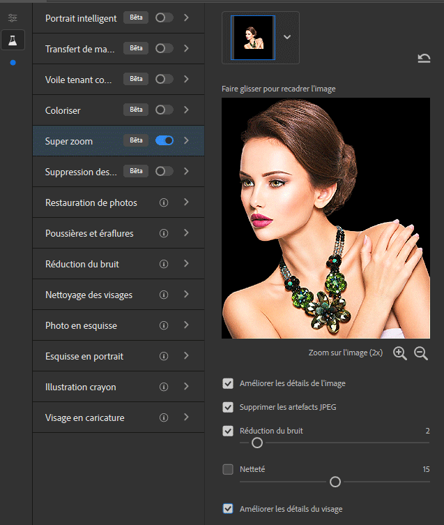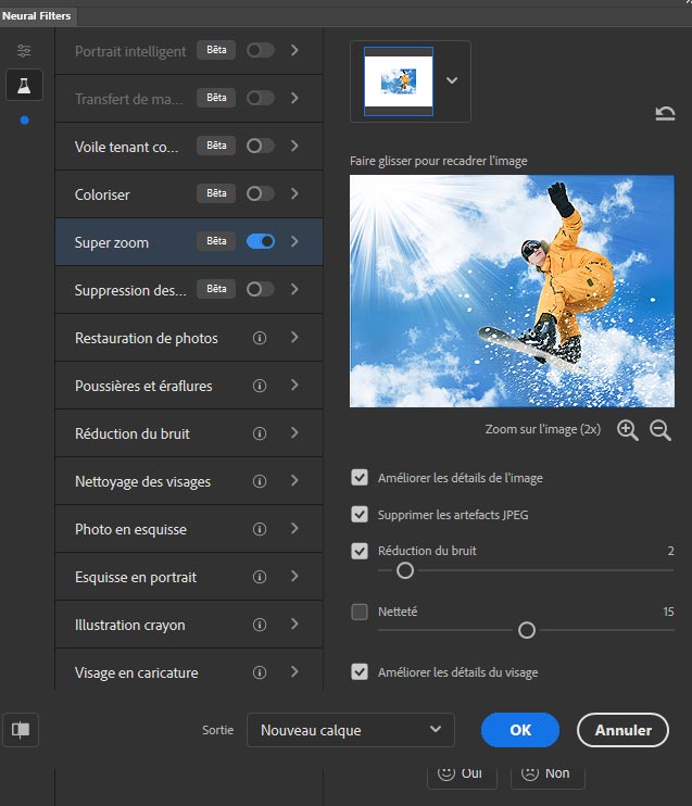 5 - Filtre, Neural filters, Super zoom avec les mêmes paramètres que ci-dessus :