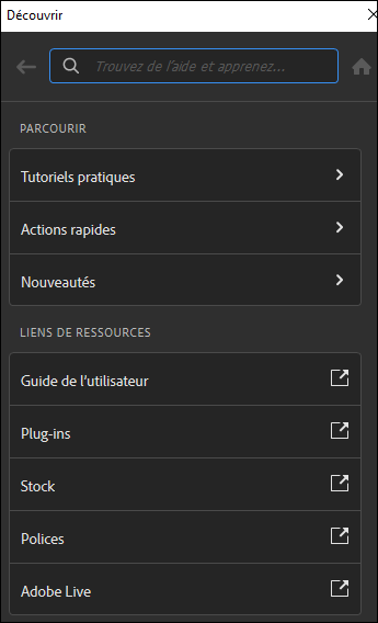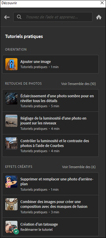 6 - Revenez en arrière dans le Panneau Découvrir et choisissez Tutoriels pratiques.