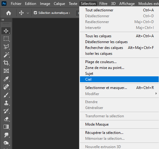 Automatiquement, Photoshop sélectionne la zone du ciel.