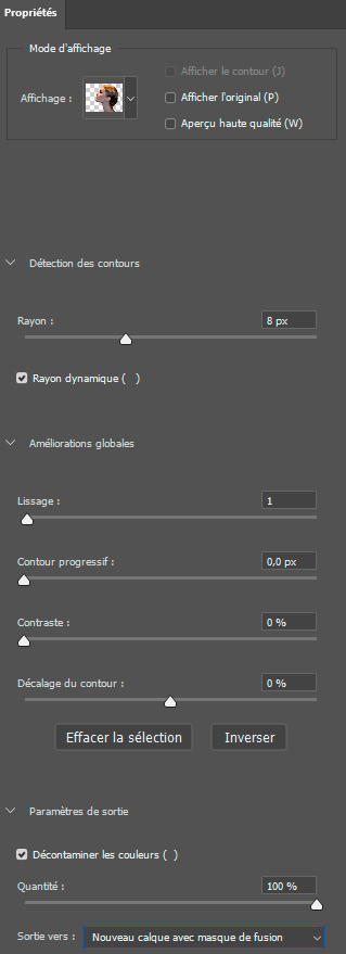 Dans la Fenêtre Propriétés ajustez les paramètres et cochez Décontamination des couleurs :