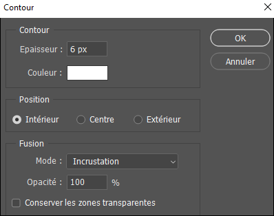 Édition, Contour, 6 pixels en blanc, position intérieure, mode de fusion Incrustation :