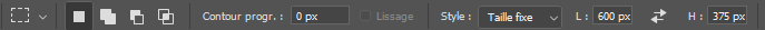 Dans la Barre d'options, définissez une taille fixe de 600 x 375 pixels :