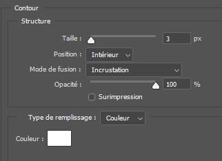 Édition, Contour, 3 pixels en blanc, Position intérieure, mode de fusion Incrustation :