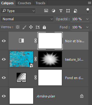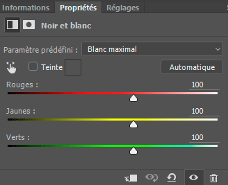 6 - Au Bas de la Palette calques, cliquez sur Créer un calque de remplissage ou de réglage, Noir et blanc, sélectionnez Blanc maximal :
