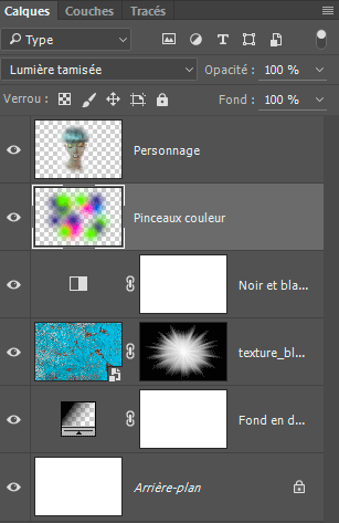 Dans la Palette calques, glissez-le sous le calque du personnage et attribuez-lui le mode de fusion Lumière tamisée.