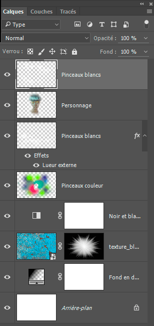Avec le blanc en premier plan, sur un nouveau calque, et en réduisant leur taille, appliquez quelques pinceaux.