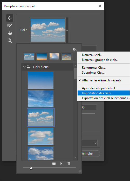4 - Vous pouvez choisir un ciel en fonction de ce qui vous est proposé ou Importer vos propres images de ciel :