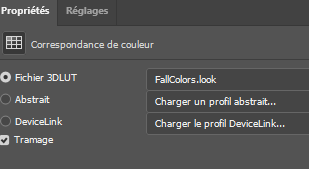 Dans la fenêtre Propriétés, choisissez le Fichier 3dLUT Fallcolors.look :
