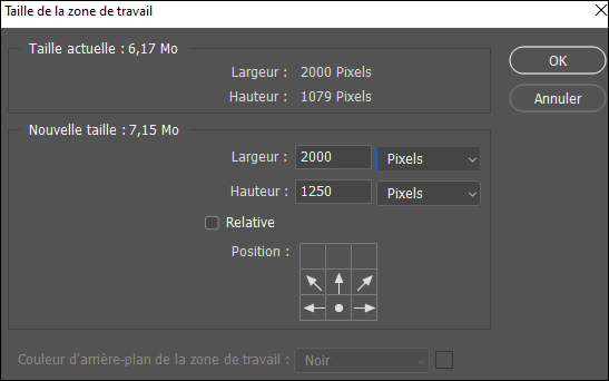 8 - Image, Taille de la zone de travail : décochez Relative, 2000 x 1250 pixels placement milieu bas :