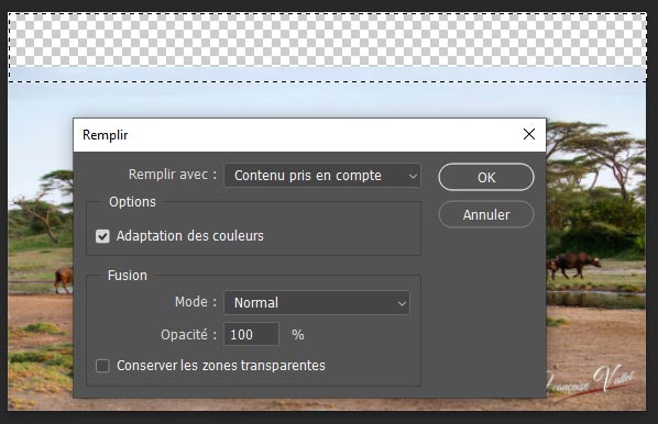 9 - Avec l'outil de sélection rectangle (M), tracez une sélection sur la zone transparent et une partie du ciel.
