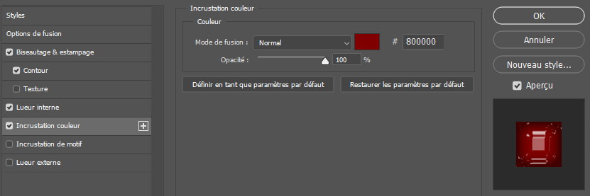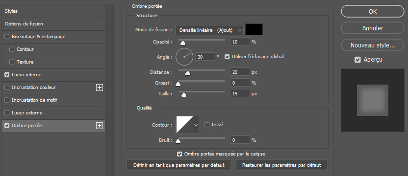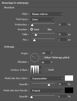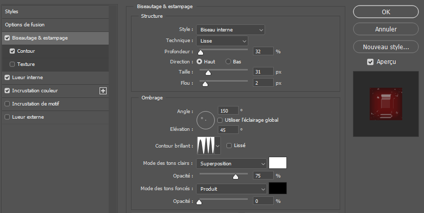 Rouvrez la Boîte de dialogue style de calque et modifiez l'angle de l'élévation à 45° :